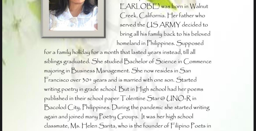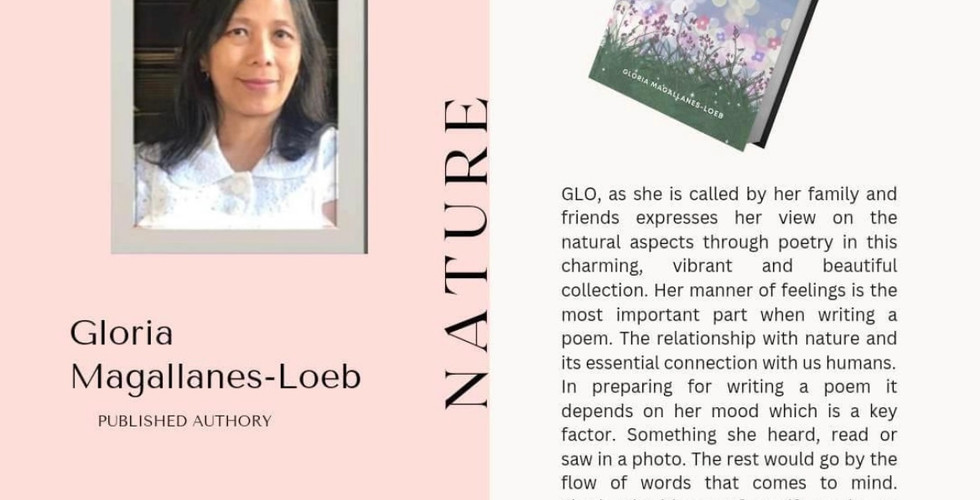 Gloria Magallanes-Loeb is an Author, poetess and moderator. She has lived in San Francisco (USA), for over 30+ years. She is married and has one grown son. Her married name is pronounced like an Ear Lobe, which many people can't say correctly. She studied Bachelor of Commerce and majored in Business Management. Gloria started writing poetry in grade school but it was in high school, her poems were published in the school paper, Tolentine Star. She is a member of various International Poetry Groups. Gloria is also a contributor of 14 book anthologies, 'Saving One Poem at a Time', 'ColoveOration', 'Rainbows and Daydreams', 'The Art of Poetry', 'The 5th World Book of Gogyoshi', to name a few. She is also a Lifetime Achievement Awardee given by Aida Roque, founder of GWWC and The Poetic Gold Flame Ink Society. She participated in an Open Mic w/ other poets, reciting poems live through Zoom by Annette Tarpley, Founder of Passion of Poetry (POP FB Group). Gloria was also invited by "Coffee with Loi" on her YouTube Channel by founder, Loi Monroe of Pen Wonders International and Vibrant Poetry Group. Gloria's new book, 'NATURE: The Moon, The Sun, Flowers and Feelings', published by McKinley Publishing Hub (MPH), is now currently available on Amazon, Lulu.com and Barnes & Noble.