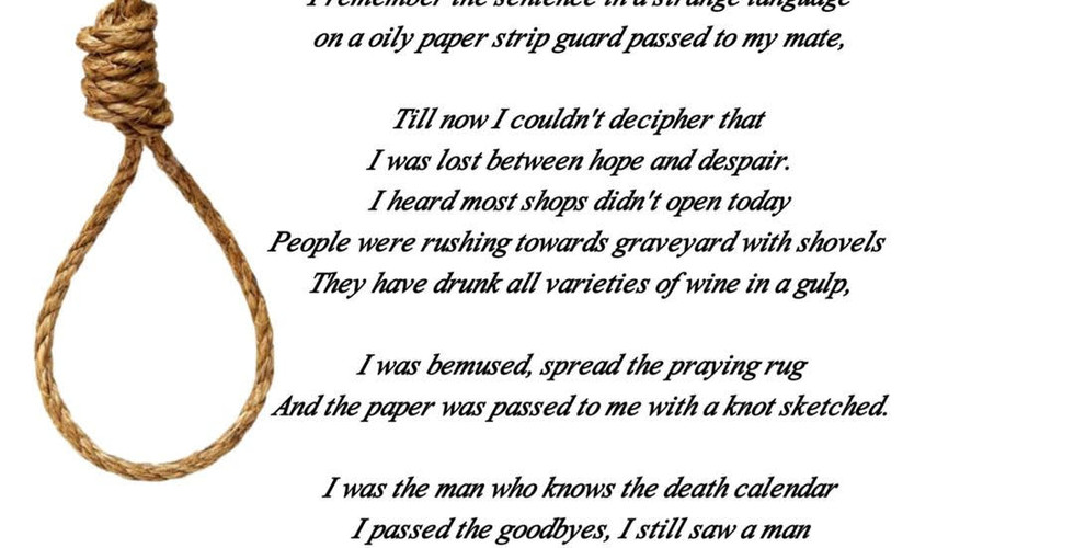 Peeping through the broken window My ears deaf and my mouth numb Along the police sirens and honking horns of ambulances I remember the sentence in a strange language on a oily paper strip guard passed to my mate. Till now I couldn't decipher that I was lost between hope and despair. I heard most shops didn't open today People were rushing toward graveyard with shovels They have drunk all varieties of wine in a gulp I was bemused, spread the praying rug And the paper was passed to me with a knot sketched. I was the man who knows the death calendar I passed the goodbyes, I still saw a man Peeking through the broken window.